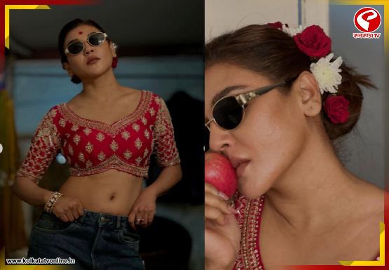 পাথরের কাজ করা উজ্জ্বল লাল ব্লাউজ, তার সঙ্গে ধূসর জিন্স— এই অদ্ভুত সুন্দর মিশেলে তৈরি হয়েছে অনন্য স্টাইল স্টেটমেন্ট। এ যেন এক অনবদ্য রূপ তাঁর। কপালে লাল সিঁদুরের টিপ, মাথার খোঁপায় লাল-সাদা গোলাপের গুচ্ছ, চোখে রোদচশমার চার্ম। হাতে আবার মানাইসই ডিজ়াইনার চুড়ি।