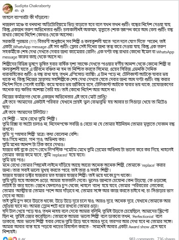 রাহুলের মৃত্যুতে ইন্ড্রাস্টির রূঢ় বাস্তবতটা সকলের সামনে উঠে এসেছে। ফের একবার অভিনেতা-অভিনেত্রীদের নিরাপত্তা নিয়ে সংশয় থেকেই যাচ্ছে। অভিনেতা-অভিনেত্রীদের নিরাপত্তা নিয়ে ইতিমধ্যেই একাধিক তারকা মুখ খুলেছেন, দাবি উঠছে নিরপেক্ষ তদন্তের।এই মর্মান্তিক ঘটনার পরও টলিপাড়ার চেনা ছবিতে কোনও বদল না আসায় ক্ষোভ উগরে দিয়েছেন জাতীয় পুরস্কারপ্রাপ্ত অভিনেত্রী সুদীপ্তা চক্রবর্তী। তাঁর একটি ফেসবুক পোস্ট ঘিরে এখন তোলপাড় স্টুডিও পাড়া। সুদীপ্তা তাঁর দীর্ঘ এবং আবেগঘন পোস্টে একরাশ তিক্ত প্রশ্ন তুলেছেন। তিনি সরাসরি আঙুল তুলেছেন টলিউডের সেই তথাকথিত ‘একটাই পরিবার’ তকমাটির দিকে। সুদীপ্তা আক্ষেপ করে লিখেছেন, শিল্পী কি তবে কেবলই ‘দুই পয়সার শিল্পী’? একজন রিকশাচালক বা সবজি বিক্রেতার ইউনিয়নও সহকর্মীর মৃত্যুতে দোকান বন্ধ রাখে, কিন্তু শিল্পীদের ক্ষেত্রে সেই সৌজন্যটুকুও কেন দেখা গেল না সেই প্রশ্ন ঘুরপাক খাচ্ছে তাঁর মনে। অভিনেত্রী তাঁর পোস্টে সহকর্মীদের সতর্ক করে দিয়ে লিখেছেন, হাজার কষ্ট বুকেও লিপস্টিক মেখে প্রেমের অভিনয় চালিয়ে যেতে হয়। কারণ, প্রতিবাদ করলেই ‘ব্যান’ হওয়ার ভয়, কাজ হারানোর আতঙ্ক।