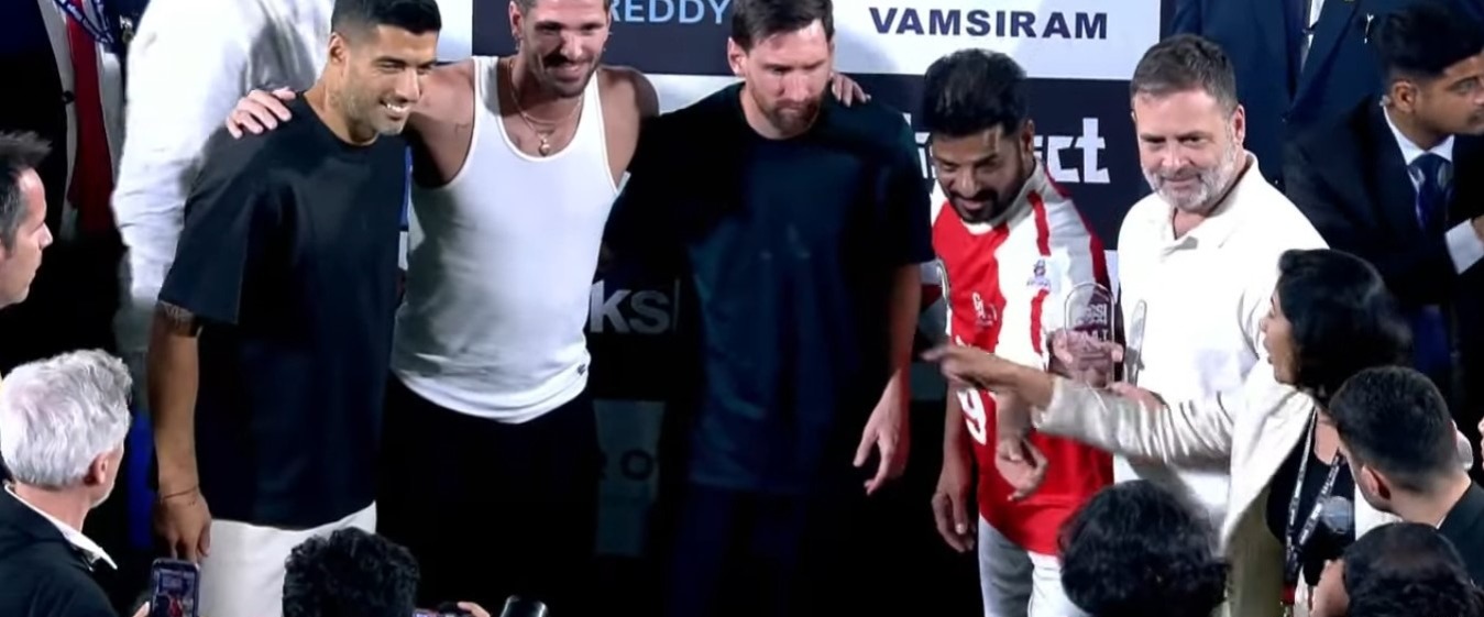 ওয়েব ডেস্ক: ফুটবলের রাজপুত্র লিওনেল মেসিকেই খুব একটা ভাল করে বরণ করে নিতে পারল না কলকাতা। শনিবার সকালে যুবভারতীয় ক্রীড়াঙ্গনে ধুন্ধুমার পরিস্থিতি তৈরি হল। যুবভারতীর বিশৃঙ্খলার জন্য শতদ্রু দত্তকে (Satadru Dutta) দায়ী করে গ্রেফতার করা হয়েছে। অথচ সন্ধ্যায় সম্পূর্ণ উল্টো চিত্র দেখা গেল হায়দরাবাদে। চোখ ভরে মেসিকে দেখল হায়দরাবাদবাসী (Messi in Hyderabad)। শনিবার সন্ধ্যায় হায়দরাবাদে কানায় কানায় পূর্ণ রাজীব গান্ধী স্টেডিয়ামে উৎসবের আবহ তৈরি করলেন লিওনেল মেসি(Messi in Hyderabad), লুইস সুয়ারেজ ও রদ্রিগো ডি পল। অনাবিল হাসি, পায়ের জাদু, পেনাল্টি শ্যুট আউটে হায়দরাবাদের মন ভরিয়ে দিলেন আর্জেন্টিনার বিশ্বকাপজয়ী তারকা লিওনেল মেসি (Lionel Messi)।এদিন রাজীব গান্ধী স্টেডিয়ামে ছিলেন লোকসভার বিরোধী দলনেতা রাহুল গান্ধী (Rahul Gandhi)।