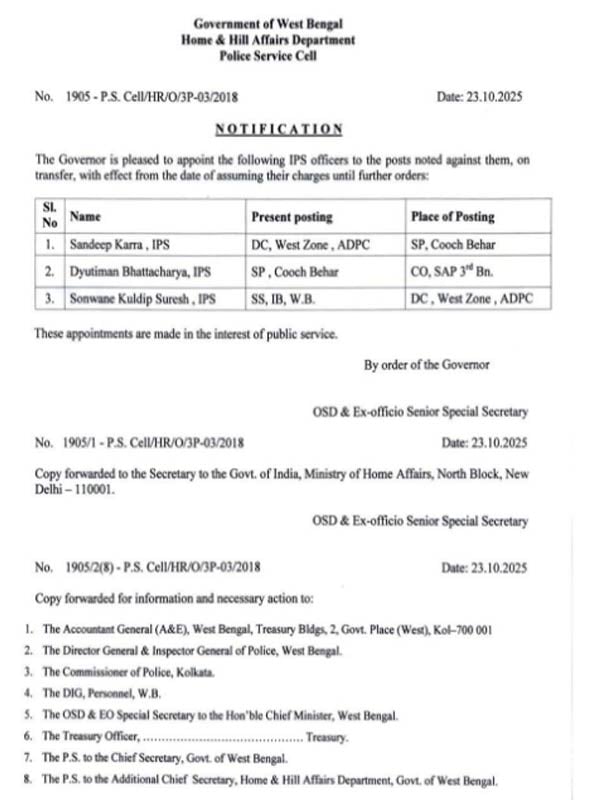 বৃহস্পতিবার দ্যুতিমানকে পদ থেকে সরিয়ে দেওয়ার বিজ্ঞপ্তি জারি করেছে নবান্ন। তাঁর জায়গায় এসেছেন সন্দীপ, তিনি ছিলেন আসানসোল দুর্গাপুর কমিশনারেটের ডিসি পশ্চিম পদে। ওই পদে পাঠানো হয়েছে সোনওয়ানে কুলদীপ সুরেশকে। তিনি পশ্চিমবঙ্গ পুলিশের গোয়েন্দা বিভাগের (আইবি) সিনিয়র সুপারিন্টেন্ডেন্ট পদে ছিলেন।